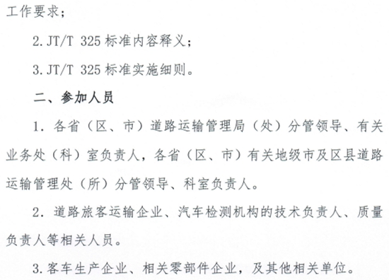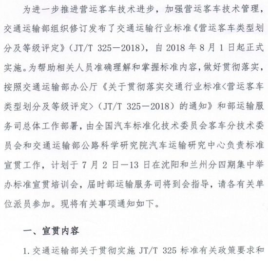 6月20日,全國汽車標準化技術委員會客車分技術委員會與交通運輸部公路科學研究院汽車運輸研究中心共同發(fā)布了關于召開《營運客車類型劃分及等級評定》(JT/T325—2018)標準宣貫會議的通知。