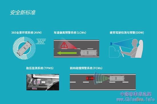 另外,360環(huán)視、LCWS、FCWS、DDW、TPMS等多項(xiàng)安全裝備和技術(shù)的保護(hù),讓海格新能源客車更安全更可靠。
