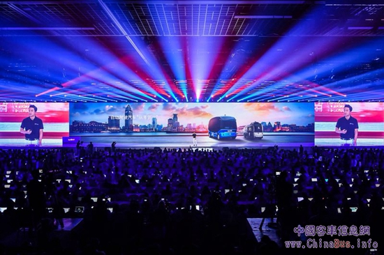 10點整,李彥宏在演講臺上視頻連線處在中國南端的廈門金龍客車阿波龍生產線現(xiàn)場,與站在總裝生產線的金龍客車董事長謝思瑜在線對話,南北共舉全球首輛L4級量產自動駕駛巴士金龍阿波龍下線儀式。