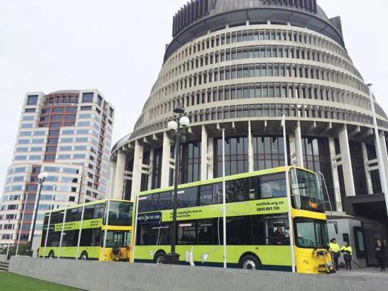 純電動雙層巴士車隊上線儀式,在新西蘭議會大廈隆重舉行。新西蘭代理總理 Winston Peters、環(huán)境部部長Hon David Parker、運輸部副部長 Julie Anne Genter、大惠靈頓地區(qū)市政府代表等出席活動,并與嘉賓一起體驗了新型純電動雙層巴士。