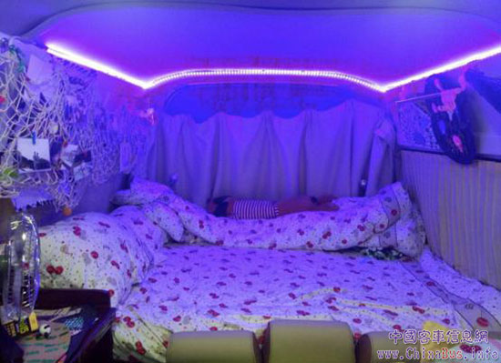 為了讓車輛更上檔次,熊靈為愛車鋪設(shè)了木地板,熊靈在親戚的家具廠買來1.2米X2.4米的三塊實(shí)木板,裝完地板用剩的板材做了個(gè)橫置床(1.85X1.5米),材料費(fèi)不到1000元。