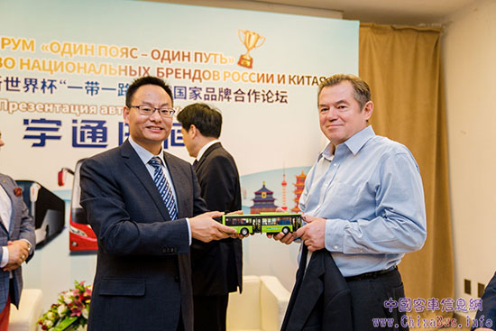 宇通客車向俄聯(lián)邦總統(tǒng)經(jīng)濟(jì)顧問(wèn)格拉茲耶夫(右)贈(zèng)送車模