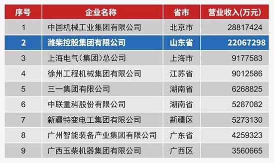 2018年7月13日,第十四屆“中國(guó)機(jī)械工業(yè)百?gòu)?qiáng)、汽車工業(yè)三十強(qiáng)企業(yè)信息發(fā)布會(huì)”在山東臨沂召開(kāi)。濰柴集團(tuán)以年?duì)I業(yè)收入2206.7億元,位列2017年中國(guó)機(jī)械百?gòu)?qiáng)第2名。