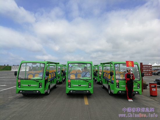 35輛身著“綠裝”的宇通純電動(dòng)旅游觀光車猶如“護(hù)花使者”,威武整齊地排列著......