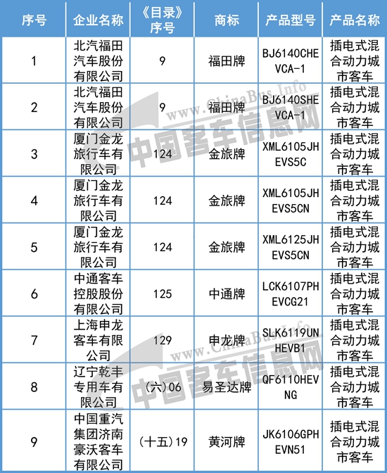 插電式混合動(dòng)力客車上榜車型:
