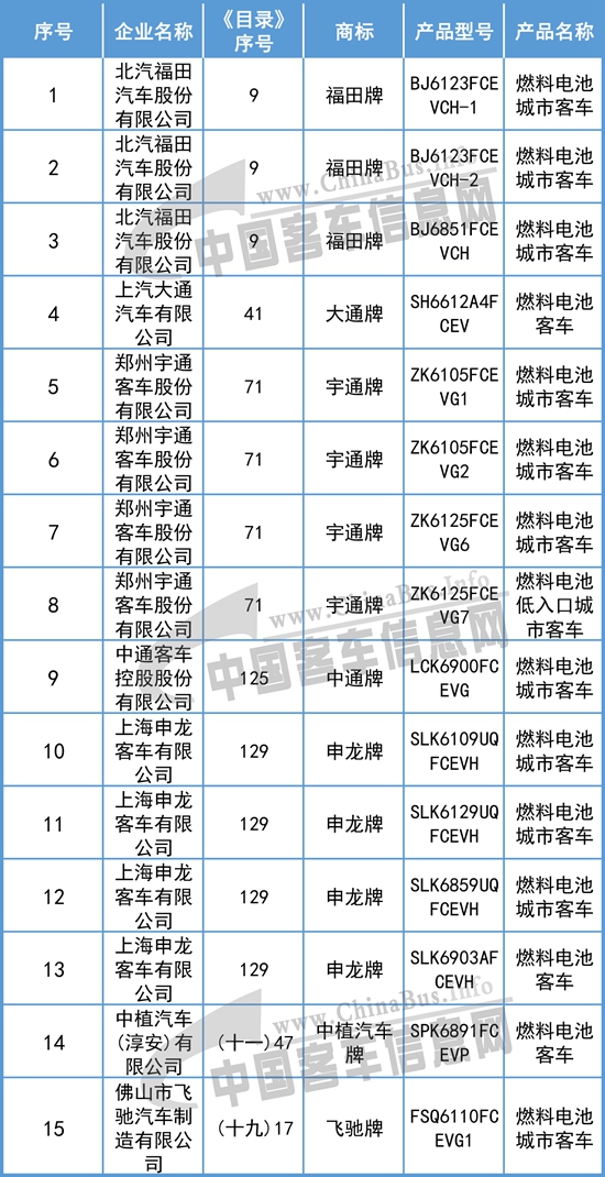 燃料電池客車上榜車型: