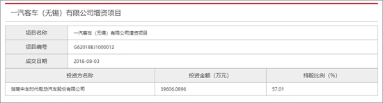 8月9日,記者獲悉,一汽客車(無(wú)錫)有限公司(一汽無(wú)錫)獲得來(lái)自湖南中車時(shí)代電動(dòng)汽車股份有限公司(中車電動(dòng))的3.96億元的投資,后者持股比例為57.01%,取代一汽客車有限公司成為一汽無(wú)錫控股股東地位。