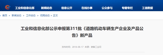 2018年8月17日,工業(yè)和信息化部在官方網(wǎng)站公示了申報第311批《道路機動車輛生產(chǎn)企業(yè)及產(chǎn)品公告》(以下簡稱《公告》)新產(chǎn)品,公示期7天,截止到8月23日。