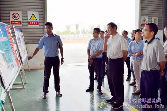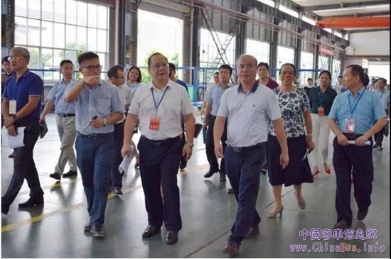 南寧市委常委、副市長周中(右二)帶隊(duì)參觀廣西申龍生產(chǎn)車間