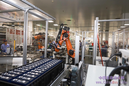 【中航鋰電生產(chǎn)線上的機(jī)器人正在有條不紊的工作】