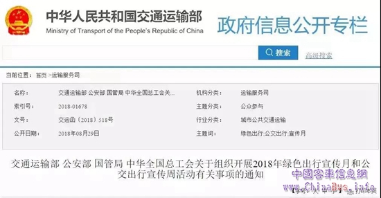 為貫徹落實(shí)黨的十九大關(guān)于“開(kāi)展創(chuàng)建節(jié)約型機(jī)關(guān)、綠色家庭、綠色學(xué)校、綠色社區(qū)和綠色出行等行動(dòng)”的決策部署,深入實(shí)施公交優(yōu)先發(fā)展戰(zhàn)略,倡導(dǎo)綠色、安全、文明出行,交通運(yùn)輸部、公安部、國(guó)管局、中華全國(guó)總工會(huì)發(fā)出通知,組織開(kāi)展2018年綠色出行宣傳月和公交出行宣傳周活動(dòng),倡導(dǎo)市民綠色出行。