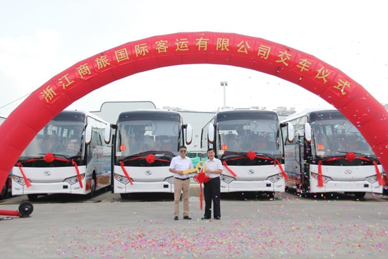 9月6日,金龍客車廠區(qū),一批身戴喜慶大紅花的金龍XMQ6112一字排開,在初秋陽光下顯得格外耀眼。當(dāng)天,批量XMQ6112正式交付浙江商旅國際客運(yùn)有限公司(以下簡稱“浙江商旅”)。