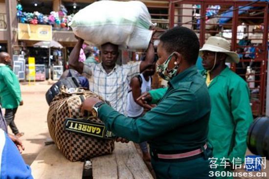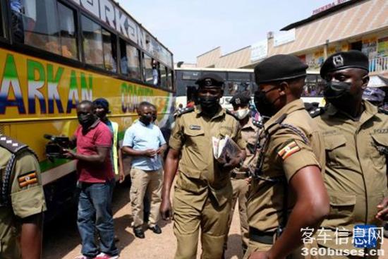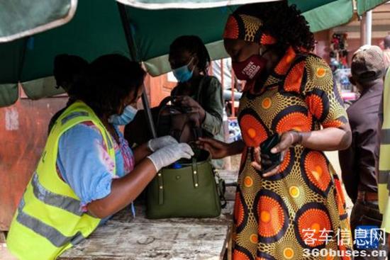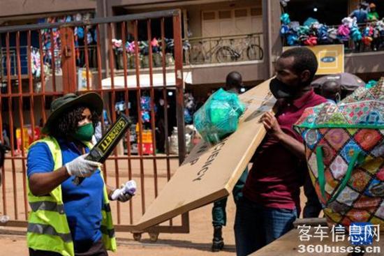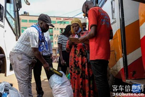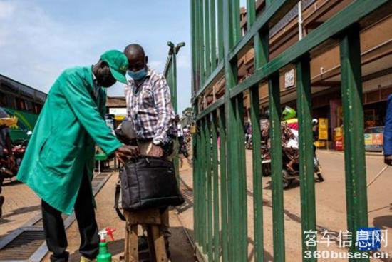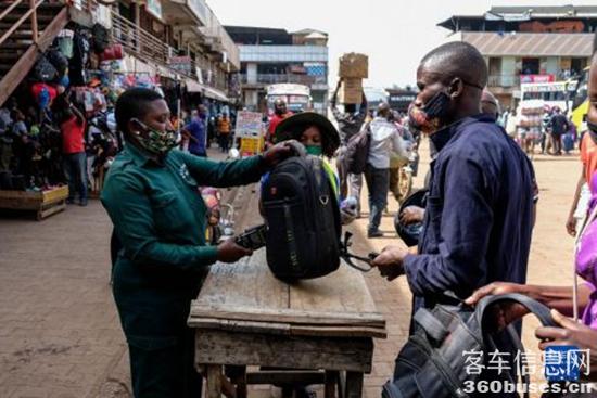 10月26日,安檢人員在烏干達(dá)坎帕拉一處公交車站檢查乘客行李。