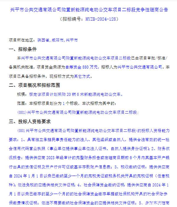 陜西省興平市20輛6米純電動(dòng)公交車(chē)購(gòu)置項(xiàng)目