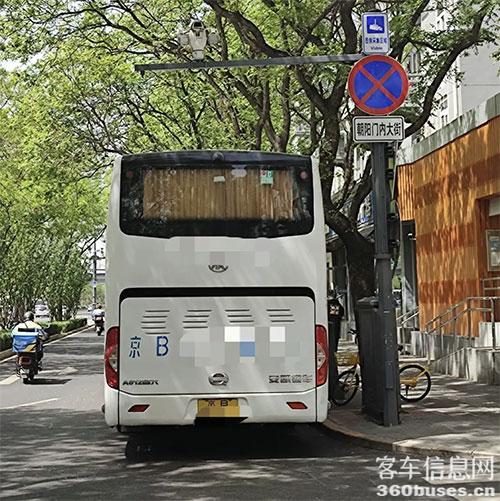 東四西大街與美術(shù)館東街交口處,有一個旅游大巴臨時停車點,是附近唯一合法??看蟀偷穆穫?cè)停車位。這里的秩序就和諧很多,京B號牌的大巴車可以在這里???0分鐘(以內(nèi)),上下客、隨即駛離。