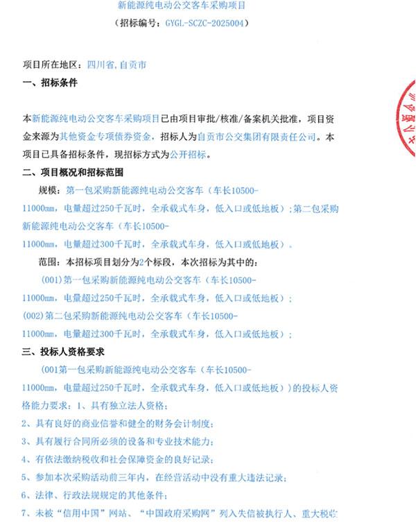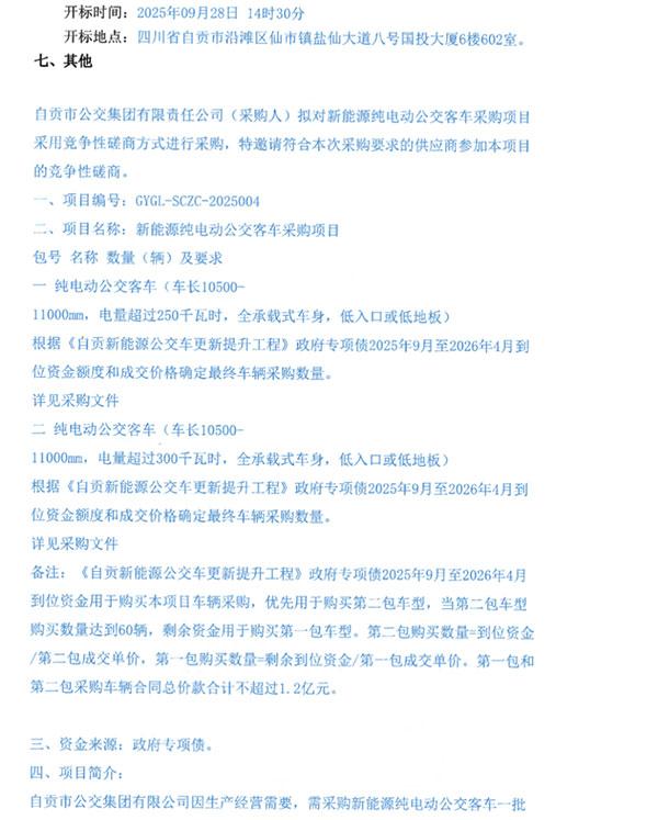 該項目分為2個標段,其中第一包采購純電動公交車(車長10500-11000mm,電量超過250千瓦時,全承載式車身,低入口或低地板);第二包采購純電動公交車(車長10500-11000mm,電量超過300千瓦時,全承載式車身,低入口或低地板)。根據(jù)《自貢新能源公交車更新提升工程》政府專項債2025年9月至2026年4月到位資金額度和成交價格確定最終車輛采購數(shù)量。第一包和第二包采購車輛合同總價款合計不超過1.2億元。