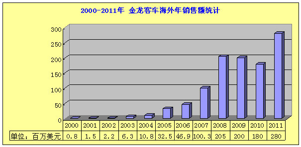 2008年,大金龍破冰法國市場,包括XMQ6800、XMQ6900、XMQ6127三款車型60多輛客車先后出口當(dāng)?shù)兀?011年大金龍?jiān)诜▏袌龅匿N量成功突破100輛;