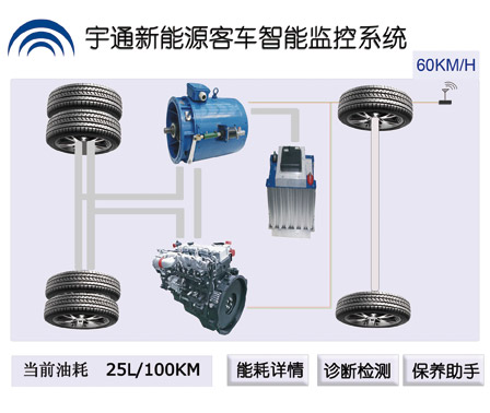 新能源智能觸摸屏;宇通新能源客車智能監(jiān)控系統(tǒng)可以實時地顯示車輛當(dāng)前百公里油耗、故障信息提示以及保養(yǎng)信息的提示。