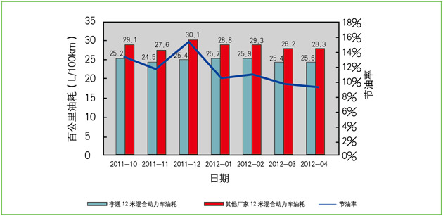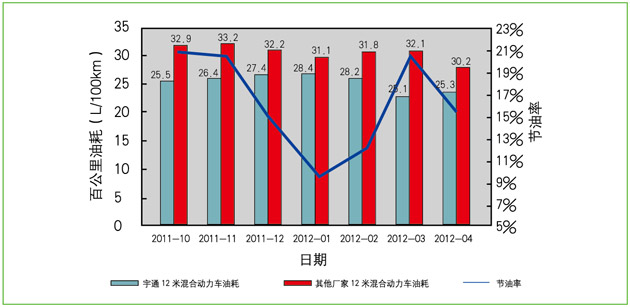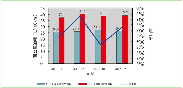 2011年10月份,2輛ZK6126CHEVGAA正式投入???2路運營,運行里程超過7.5萬公里。通過數據對比,11.6米混合動力客車相對于傳統(tǒng)10.3米車,整車節(jié)油率達到30%以上。