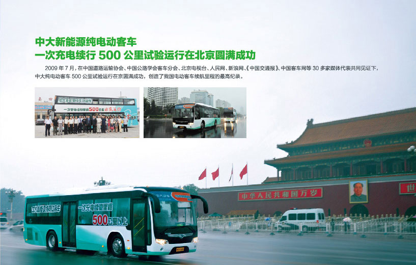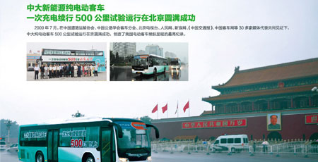 | 中大汽車集團歷經12年研發(fā)集成,先后投入11億元,擁有完全自主知識產權的純電動客車以其21項專利技術,2年批量商業(yè)化的平穩(wěn)運營,率先在國家工信部獲得純電動客車5000臺技改立項批準。8月15日,全球70家知名媒體齊聚北京,參加中大電動客車率先產業(yè)化新聞發(fā)布會。中大汽車歷經十多年、耗資十多億,成功研發(fā)出擁有21項專利的新能源純電動客車,并在國內新能源客車領域首家實現(xiàn)產業(yè)化。中大純電動客車不僅實現(xiàn)了傳統(tǒng)能源替代、環(huán)保零排放,而且對世界汽車工業(yè)的革命作出了貢獻。 |