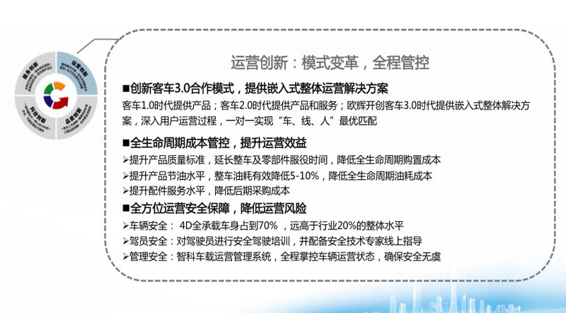 發(fā)布會(huì)上,福田汽車集團(tuán)副總裁、歐輝客車事業(yè)部總經(jīng)理解佃峰先生介紹:“人品+產(chǎn)品”,是福田歐輝當(dāng)下和未來業(yè)務(wù)的發(fā)展之路,正是有這種“責(zé)任、誠信、感恩、追求進(jìn)步”的“歐輝人精神”,才能制造出“可靠、安全、節(jié)能、技術(shù)領(lǐng)先”的客車產(chǎn)品,才能從科技、品質(zhì)、運(yùn)營管理和服務(wù)四個(gè)方面全方位、全范圍保障客車用戶企業(yè)的價(jià)值升級(jí)。
