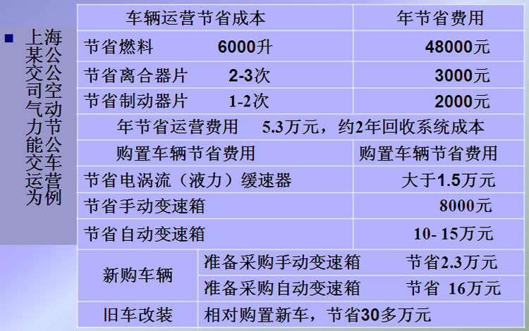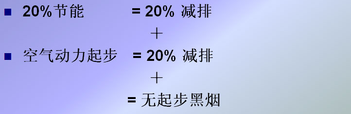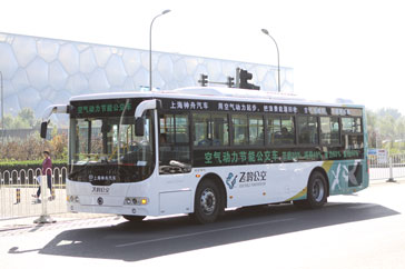 空氣動(dòng)力節(jié)能公交車:是在傳統(tǒng)公交車上,安裝一套空氣動(dòng)力系統(tǒng),將車輛怠速時(shí)浪費(fèi)的空轉(zhuǎn)能量和剎車時(shí)浪費(fèi)的動(dòng)能回收,轉(zhuǎn)化成壓縮空氣,貯存在蓄能器中。公交車用壓縮空氣的動(dòng)力起步,而不用發(fā)動(dòng)機(jī)的動(dòng)力起步,節(jié)省了發(fā)動(dòng)機(jī)起步所需的高能耗,減少了發(fā)動(dòng)機(jī)起步產(chǎn)生的高排放和黑煙,是目前性價(jià)比最高的節(jié)能減排公交車。如果將純電動(dòng)汽車稱為第一戰(zhàn)場(chǎng)、油電混合動(dòng)力汽車稱為第二戰(zhàn)場(chǎng),那么,空氣動(dòng)力公交車就是第三戰(zhàn)場(chǎng)。