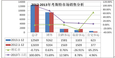 2013年1-12月份國內(nèi)考斯特市場累計銷售12569輛,與去年同期相比略有下滑。作為政府、企事業(yè)單位、公檢法司、星級酒店接待等團體市場累計銷售9262輛,占據(jù)考斯特市場壟斷位置;公路、旅游市場占據(jù)考斯特市場的20%左右,而公交客運雖然增幅較大,但基數(shù)較低,僅占市場份額的5%左右(詳見左表,數(shù)據(jù)來源:車管所上牌數(shù))。