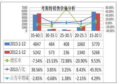 產(chǎn)品定位:按照考斯特產(chǎn)品價位分布來看,2013年高端、中高端市和中低端市場是下滑的,而中端和低端市場是增長。但是,從消費者發(fā)展趨勢判斷,未來中高端和中低端是市場發(fā)展的主力,即30萬左右和20-25萬元的產(chǎn)品是市場增長的空間,企業(yè)需在產(chǎn)品的底盤舒適性,整車噪音控制、產(chǎn)品的可靠性和服務(wù)方面下足功夫。