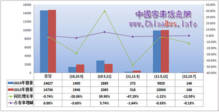 根據(jù)國內(nèi)上牌情況,中國客車信息網(wǎng)對(duì)大型公路客車進(jìn)行了數(shù)據(jù)統(tǒng)計(jì),2013年大型公路客車?yán)塾?jì)銷售14627輛,同比略有下滑(詳見圖1),其中11.5-12m銷量最大,累計(jì)銷售9920輛,同比下降1.22%;10.5-11m增幅最大,也是大型公路客車唯一增長的細(xì)分市場,累計(jì)銷售2889輛,同比增長39.90%; 10-10.5m累計(jì)銷售1400輛,同比下滑28.06%;11-11.5m和12-13.7m基數(shù)較小。