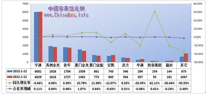 2013年大型公路客車排名前6位的企業(yè)沒有發(fā)生變化,根據(jù)中國客車信息網(wǎng)統(tǒng)計(jì),宇通以6001輛排名首位,占據(jù)市場份額的40%左右;蘇州金龍銷售1926輛、青年銷售1784輛、廈門金龍銷售1509輛,排名第2至第4位,市場份額均在10%以上;廈門金旅和安凱緊跟其后,排名第五和第六位,市場份額在5%左右。前6家企業(yè)累計(jì)銷量12824輛,占據(jù)市場份額的88%,同比2012年上升3個(gè)百分點(diǎn),這種優(yōu)勢企業(yè)逐漸呈現(xiàn)強(qiáng)者愈強(qiáng),弱者愈弱的“馬太效應(yīng)”。