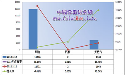 從燃油種類來看,大型公路車仍以傳統(tǒng)柴油車為主,占據(jù)市場份額的80%。近年來,國家大力提倡節(jié)能減排,發(fā)展清潔能源,天然氣產(chǎn)品在公交車市場上已經(jīng)得到大量推廣,受制于燃?xì)庠蟽?chǔ)備、基礎(chǔ)實(shí)施等因素影響,天燃?xì)猱a(chǎn)品在大型公路車產(chǎn)品上處于起步階段,中國客車信息網(wǎng)統(tǒng)計(jì)顯示,天燃?xì)獯笮凸房蛙?013年同比增長40%,占據(jù)市場份額的20%。