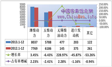 從發(fā)動(dòng)機(jī)企業(yè)來看,中國客車信息網(wǎng)統(tǒng)計(jì)顯示,2013年大型公路客車濰柴動(dòng)力累計(jì)銷售8037輛,同比增長3.45%,占據(jù)市場份額的55%;玉柴動(dòng)力累計(jì)銷售5788輛,同比下滑6.43%,占據(jù)市場份額的40%;進(jìn)口發(fā)動(dòng)機(jī)合計(jì)銷售203輛,同比下滑高達(dá)45.87%,僅占市場份額的1.4%。