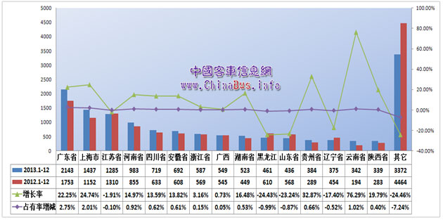 中國客車信息網(wǎng)統(tǒng)計(jì)顯示,2013年銷量過千的大型公路車區(qū)域市場有廣東省、上海市和江蘇省,500臺(tái)以上的區(qū)域市場有河南、四川、安徽、浙江、廣西和湖南,前9個(gè)區(qū)域市場銷量達(dá)到8918輛,占整體市場容量的61%,其中除江蘇市場略有下滑外,其余各市場均增長。通過我網(wǎng)統(tǒng)計(jì),不難發(fā)現(xiàn),大型公路市場一方面與地區(qū)經(jīng)濟(jì)情況以及人口密集型分不開的。