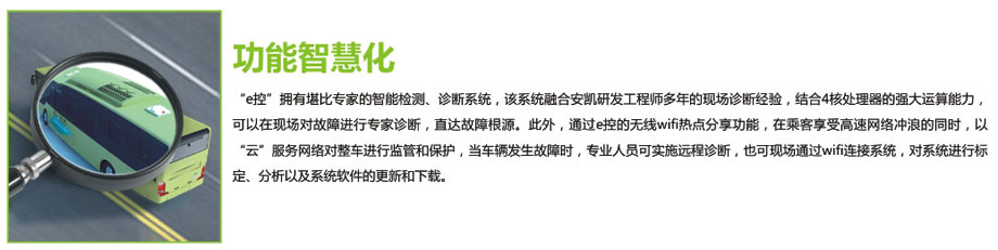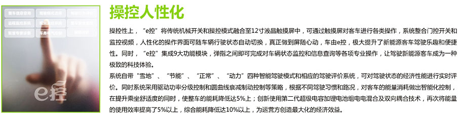 安凱新能源“e控”系統(tǒng)是安凱卓越電管理系統(tǒng)(I-EMS)的全面升級(jí),以“整車控制系統(tǒng)”、“電機(jī)驅(qū)動(dòng)系統(tǒng)”和“能量管理系統(tǒng)”為基礎(chǔ),集合操控人性化、安全多層化、功能智慧化三大特點(diǎn),通過電容多點(diǎn)觸控式交互操作,帶來科技、舒適的駕乘體驗(yàn),引領(lǐng)中國新能源客車全面進(jìn)入智能大屏?xí)r代。