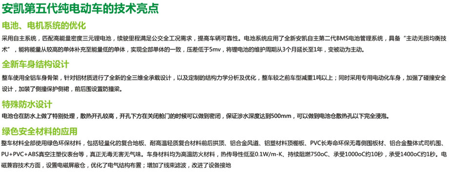 安凱第五代純電動(dòng)客車,搭載“e控”系統(tǒng),配合第五代車全鋁車身,在動(dòng)力電池最優(yōu)工況下勻速續(xù)駛里程達(dá)到500公里以上,在公交工況上,續(xù)駛里程仍可達(dá)到350公里以上。相比第四代電動(dòng)客車,整車?yán)m(xù)航里程提升30%,綜合能耗降低10%以上。【詳細(xì)】