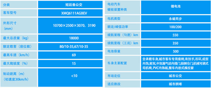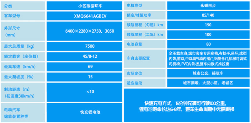 閃電騎士XMQ6641AGBEV小車身,大容量,最大容納45人,采用快速充電方式,單次充電里程100km,行駛一個短線循環(huán)僅需充電5-7min,是大型社區(qū)微循環(huán)、機場貴賓擺渡、城市公交和軌道交通接駁等的最佳選擇。