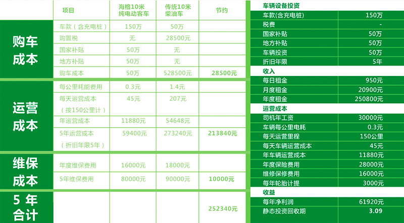 以海格10米純電動客車為例,在政策支持下,純電動客車比傳統(tǒng)車具有較好的采購、運營與維保優(yōu)勢,投資回報優(yōu)勢顯著。