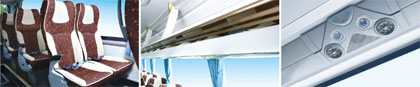 高靠背可調式乘客座椅,搭載兩點式安全帶,為乘客帶來舒適的乘車體驗;分體式豪華行李架(可選裝蓋板),高度適宜,采用防傾斜式設計;車上配置帶閱讀燈式空調出風口,彰顯人性化設計理念。