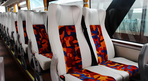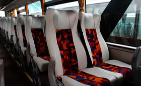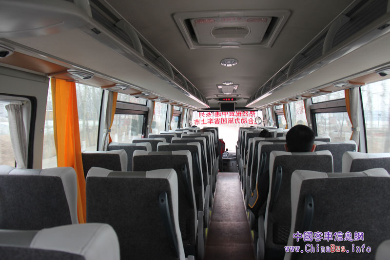(2)車身與整體效果:中通為團(tuán)體、班車、旅游車量身打造3.6米車高,體現(xiàn)客車動(dòng)態(tài)美感;車輛左側(cè)安全門設(shè)計(jì),滿足新國標(biāo),同等車長,增加2個(gè)座位和0.6立方行李艙;車輛內(nèi)部前頂線條清晰、造型流暢,視覺效果好;座椅采用特有微頭枕結(jié)構(gòu),旅途睡得舒適、睡得安心,同時(shí)可針對不同客戶,提供多款座椅配色方案;安全門處翻轉(zhuǎn)座椅,可加大應(yīng)急通道,超薄導(dǎo)游椅應(yīng)用,能有效加寬乘客上下通道。