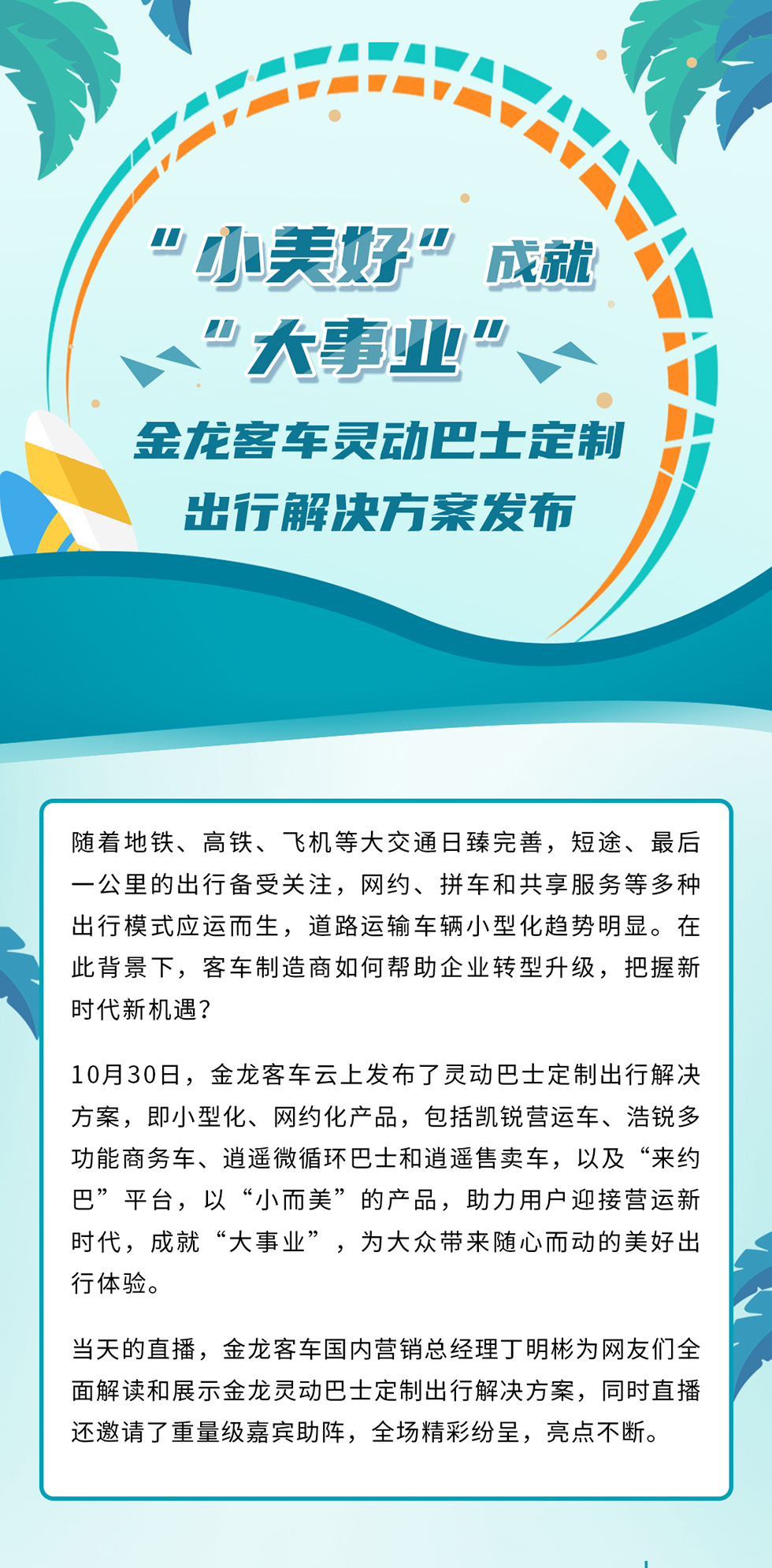 10月30日,金龍客車云上發(fā)布了靈動巴士定制出行解決方案,即小型化、網(wǎng)約化產(chǎn)品,包括凱銳營運(yùn)車、浩銳多功能商務(wù)車、逍遙微循環(huán)巴士和逍遙售賣車,以及“來約巴”平臺,以“小而美”的產(chǎn)品,助力用戶迎接營運(yùn)新時(shí)代,成就“大事業(yè)”,為大眾帶來隨心而動的美好出行體驗(yàn)。