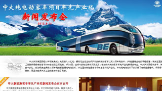 8月15日,全球70家知名媒體齊聚北京,參加中大電動(dòng)客車率先產(chǎn)業(yè)化新聞發(fā)布會(huì)。中大汽車歷經(jīng)十多年、耗資十多億,成功研發(fā)出擁有21項(xiàng)專利的新能源純電動(dòng)... 更多>>