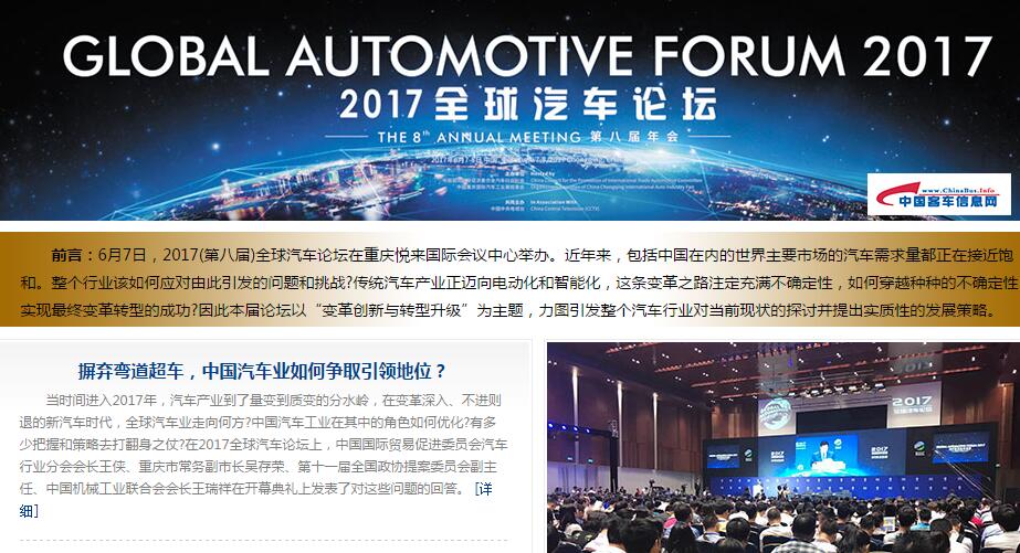 6月7日,2017(第八屆)全球汽車論壇在重慶悅來國際會議中心舉辦。近年來,包括中國在內(nèi)的世界主要市場的汽車需求量都正在接近飽和。整個行業(yè)該如何應對... 更多>>